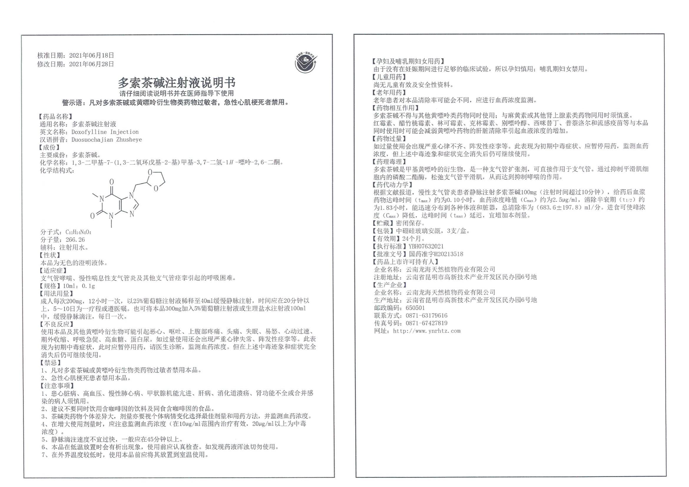 【通用名】 多索茶碱注射液